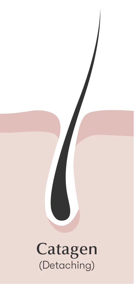 The Catagen phase is a short “transitional period” when the hair stops growing and the hair bulb detaches from the nourishing blood supply.