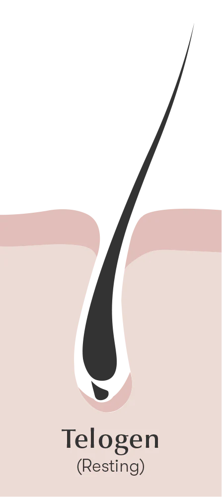 The Telogen phase is the “resting period” where the detached hair strand rests in the follicle. Hair is no longer growing but it hasn’t shed yet (about 10-15% of your hairs are in this phase). The follicle remains dormant for around 3 months while new hair growth begins to form underneath it.