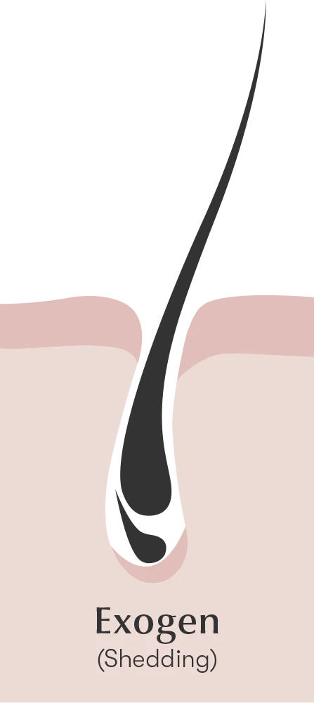The Exogen phase is the “shedding phase” where the hair finally exits or “sheds” the follicle as it begins a new anagen phase for new hair growth.